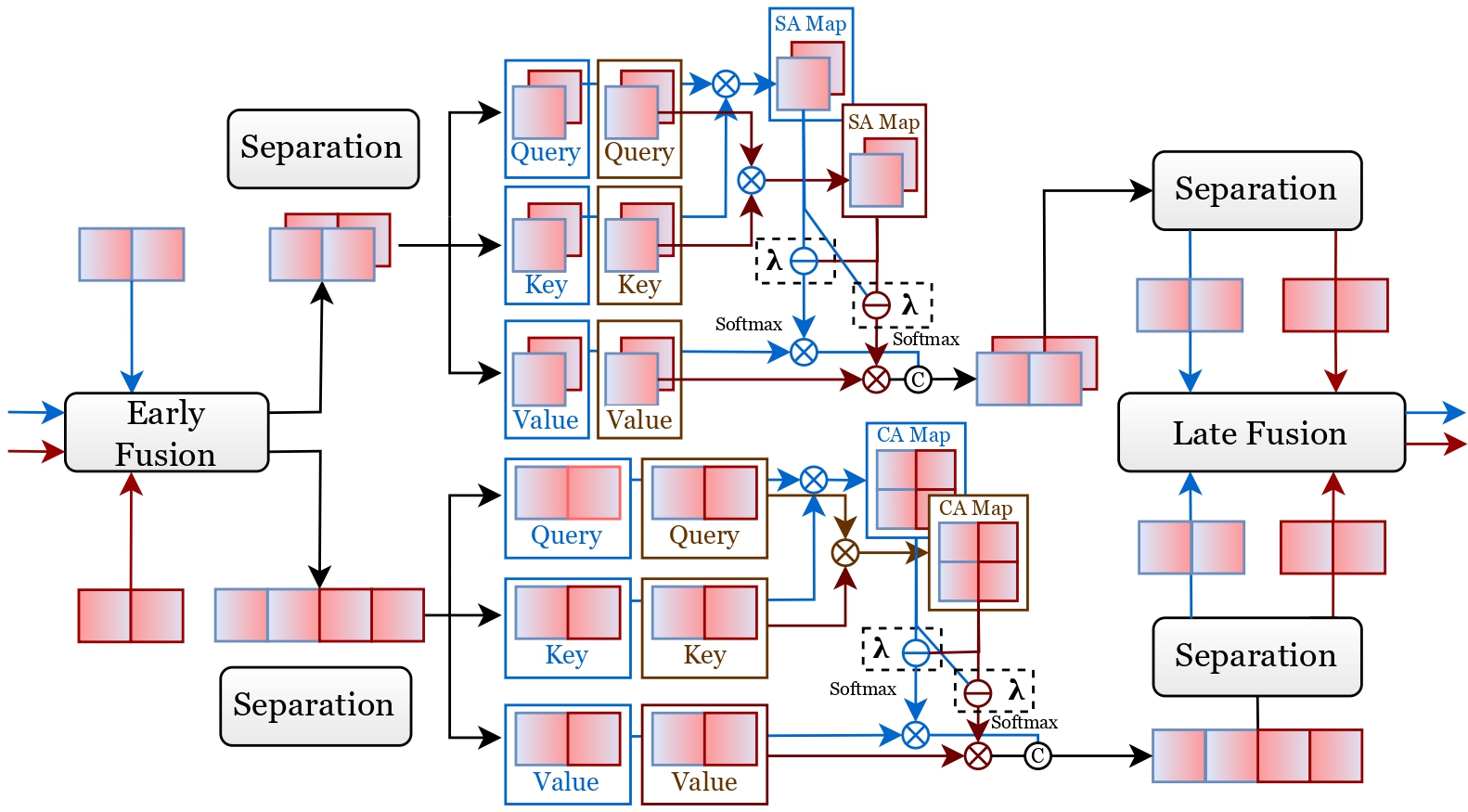 LFSB alternates between fusion (shared structure) and separation (layer disentanglement): (1) Bidirectional projection aligns transmission-reflection features; (2) Dual-dimensional attention (SA + CA) models spatial and inter-layer dependencies; (3) Differential operators A𝑡 − λℓA𝑟 suppress cross-stream interference; (4) FFNs with residuals integrate separated features.